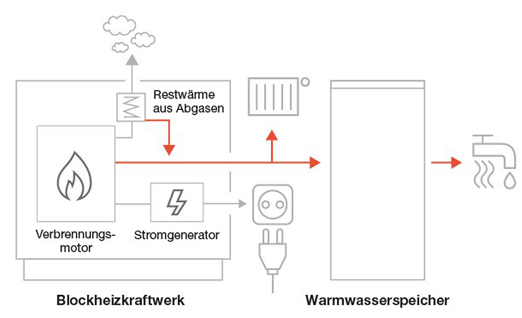 3. Zugleich erzeugt der Motor Wärme, welche für die Warmwasserbereitung oder das Beheizen der Räume genutzt werden kann.